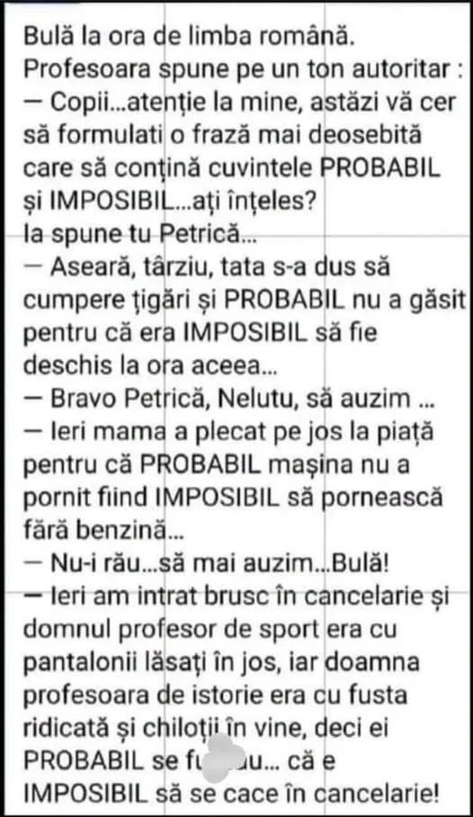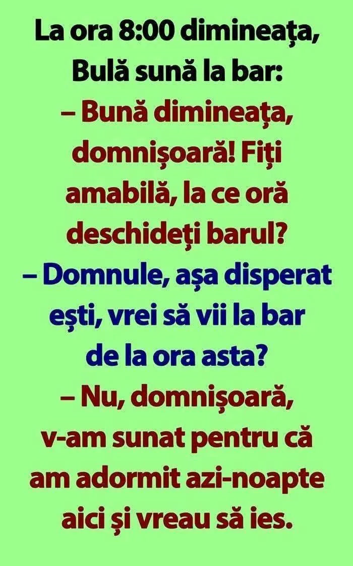 La sala de fitnessMai mulți bărbați în vestiarul de la sala de fitness. Deodată un mobil începe să sune pe o banca. Un bărbat răspunde:– [citeste mai departe…]