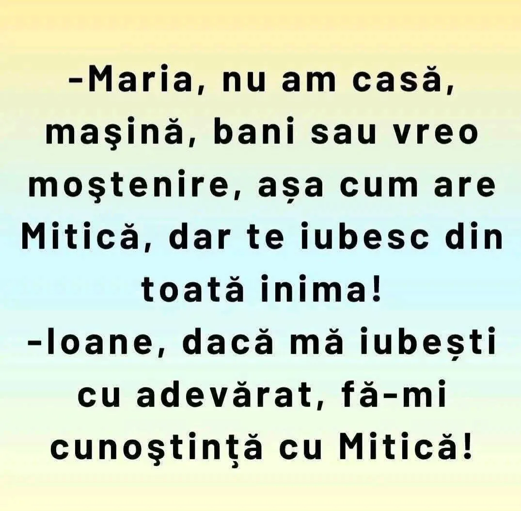 Ora de religie.Profesoara întreabă elevii:– Daca mi-aș vinde casa și mașină și aș da banii bisericii aș ajunge în rai?Clasa(în cor): Nuuu!– Daca aș face [citeste mai departe…]